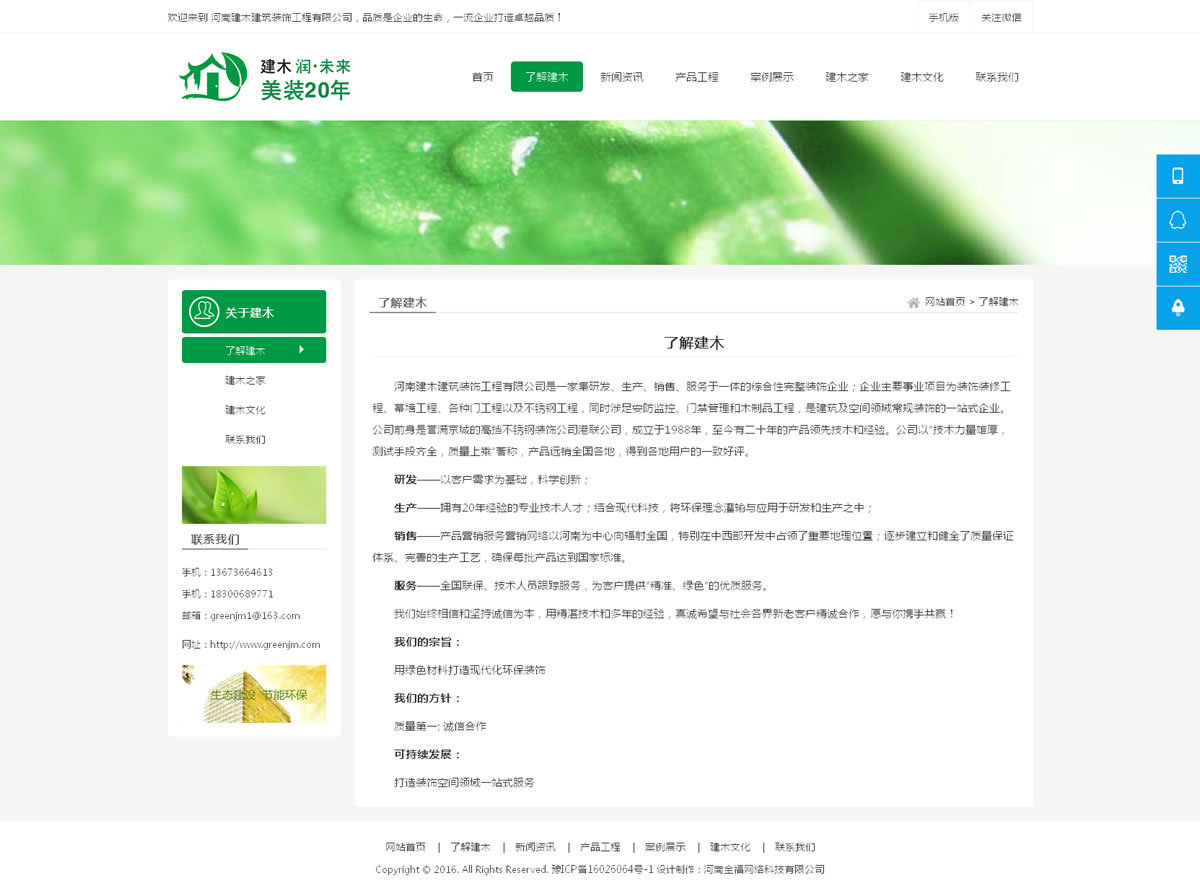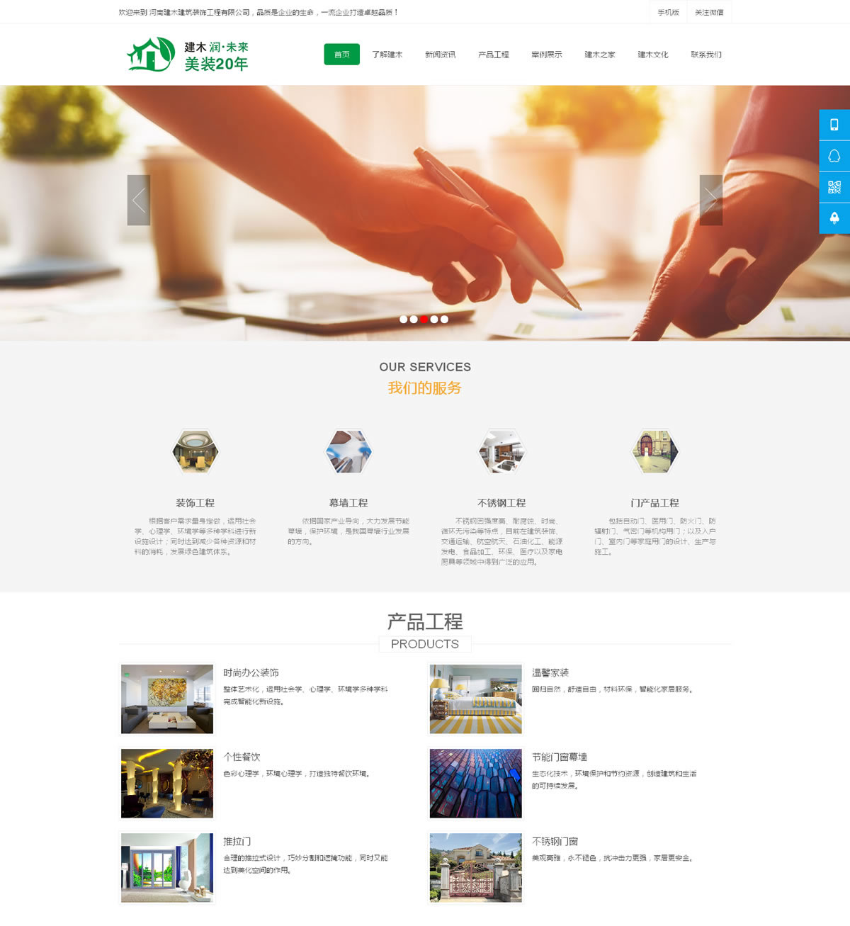 河南建木建筑裝飾工程有限公司是一家集研發(fā)、生產(chǎn)、銷售、服務(wù)于一體的綜合性完整裝飾企業(yè);企業(yè)主要事業(yè)項(xiàng)目為裝飾裝修工程、幕墻工程、各種門工程以及不銹鋼工程,同時(shí)涉足安防監(jiān)控、門禁管理和木制品工程,是建筑及空間領(lǐng)域常規(guī)裝飾的一站式企業(yè)。公司前身是譽(yù)滿京城的高擋不銹鋼裝飾公司港聯(lián)公司,成立于1988年,至今有二十年的產(chǎn)品領(lǐng)先技術(shù)和經(jīng)驗(yàn)。公司以“技術(shù)力量雄厚,測試手段齊全,質(zhì)量上乘”著稱,產(chǎn)品遠(yuǎn)銷全國各地,得到各地用戶的一致好評。